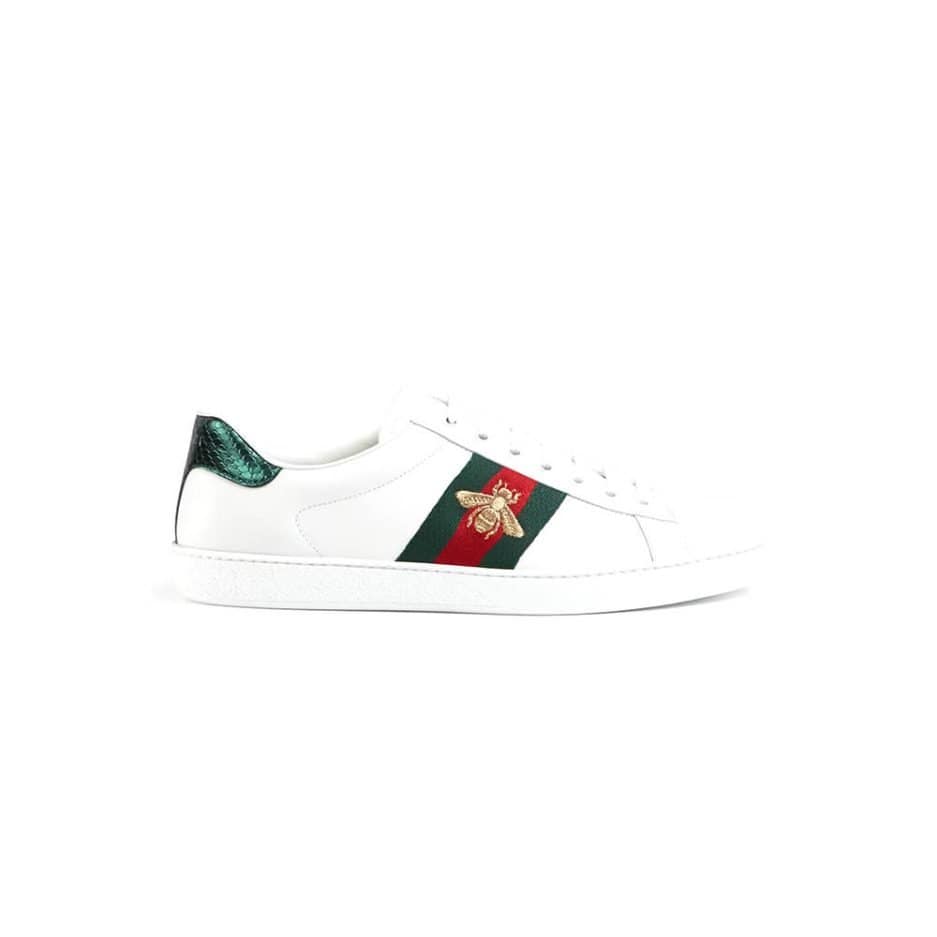White leather with red leather detail on the heel of one shoe and green on the other